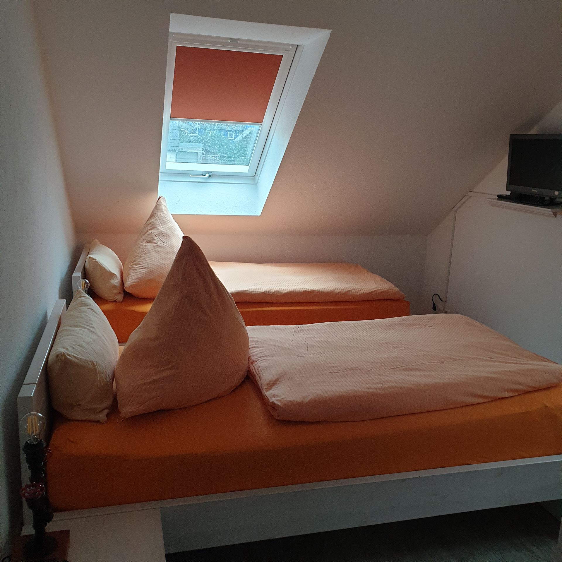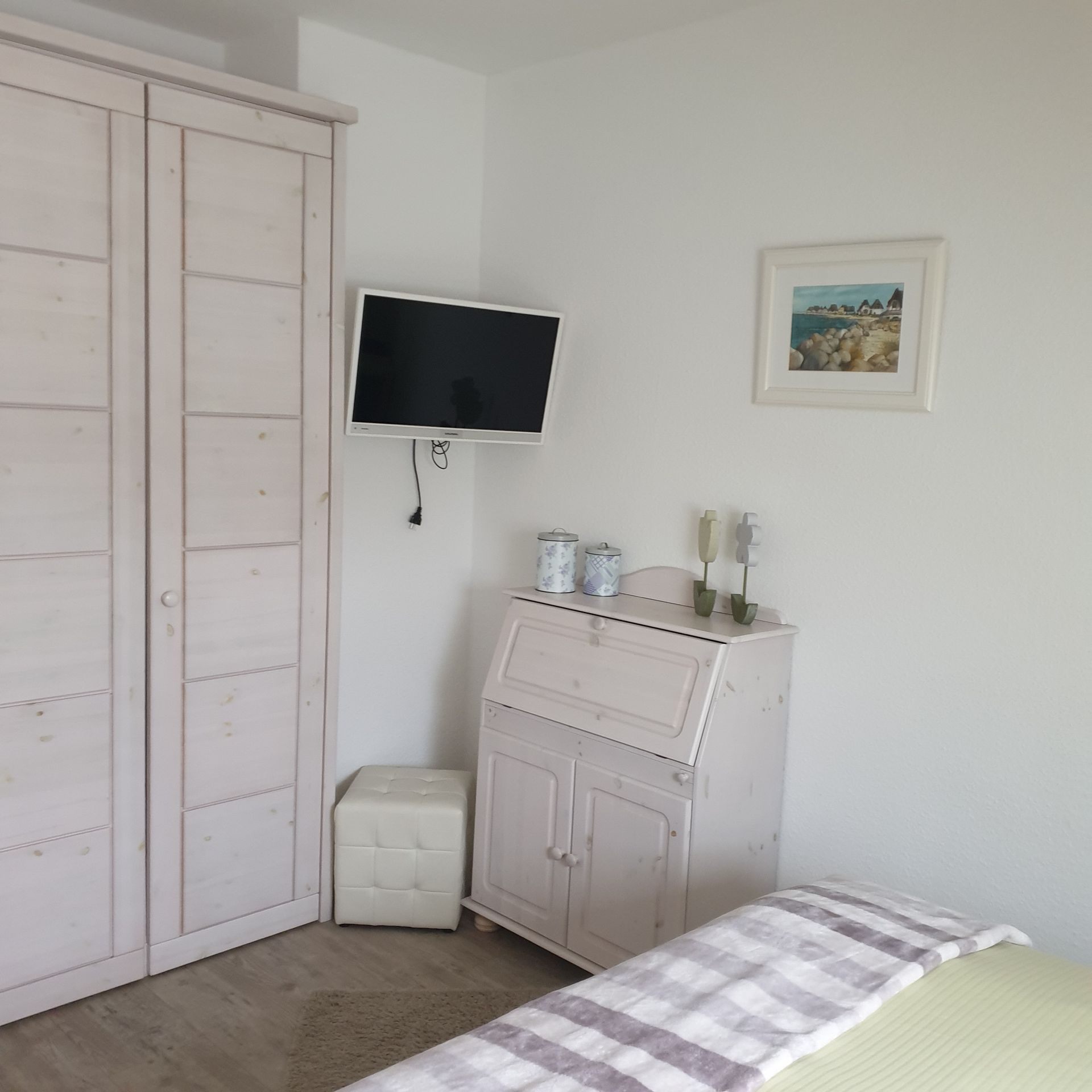 Kinderzimmer mit 2 x 100 x 200 bezogenen Betten und Topper, ein kleiner Fernseher mit integriertem DVD-Player. Im großen Schrank befindet sich ein Wechselsatz Handtücher und der Minitresor.