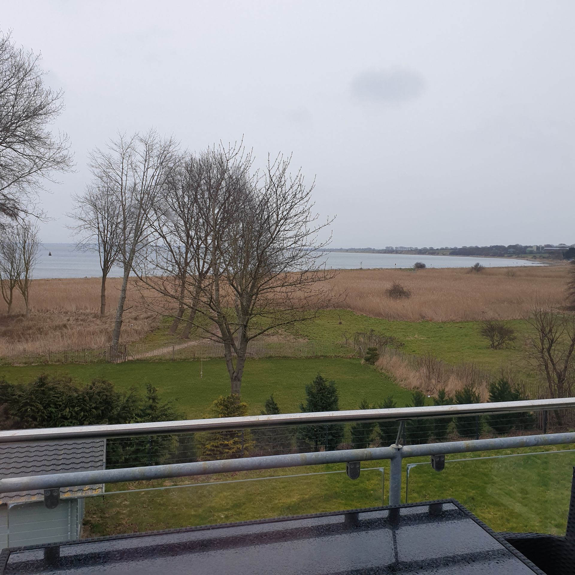 Ein gemütlicher Balkon mit Blick auf die Reede von Heiligenhafen und Richtung Leuchtturm von Strandhusen.